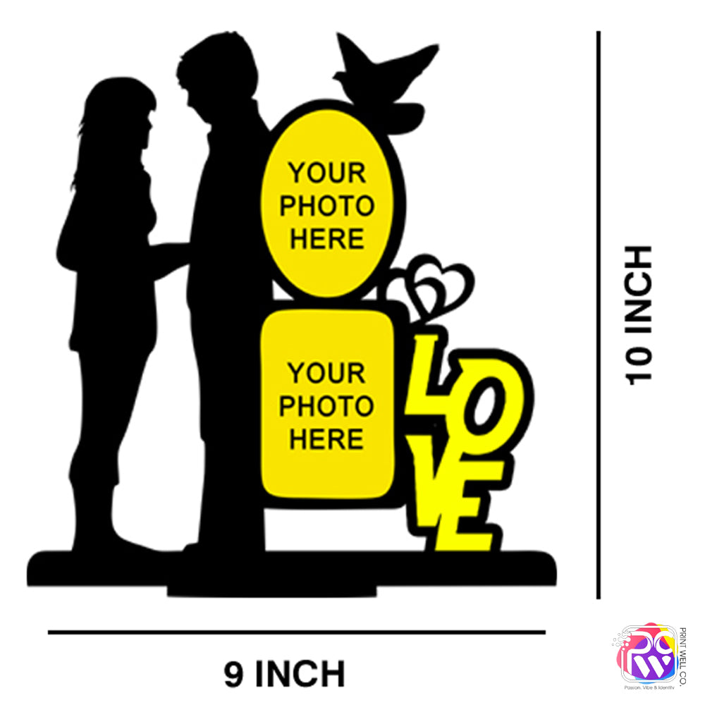 Celebrate your special bond with this beautifully crafted Customized “LOVE” Tabletop Photo Frame, featuring two photo spaces and a romantic couple silhouette. Made from high-quality MDF wood, this 9x10-inch tabletop is a perfect keepsake to showcase your most cherished memories.